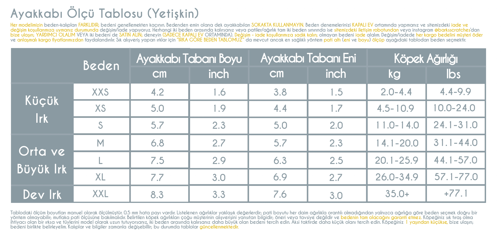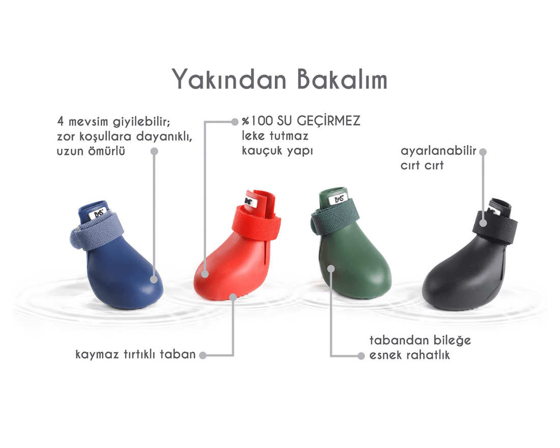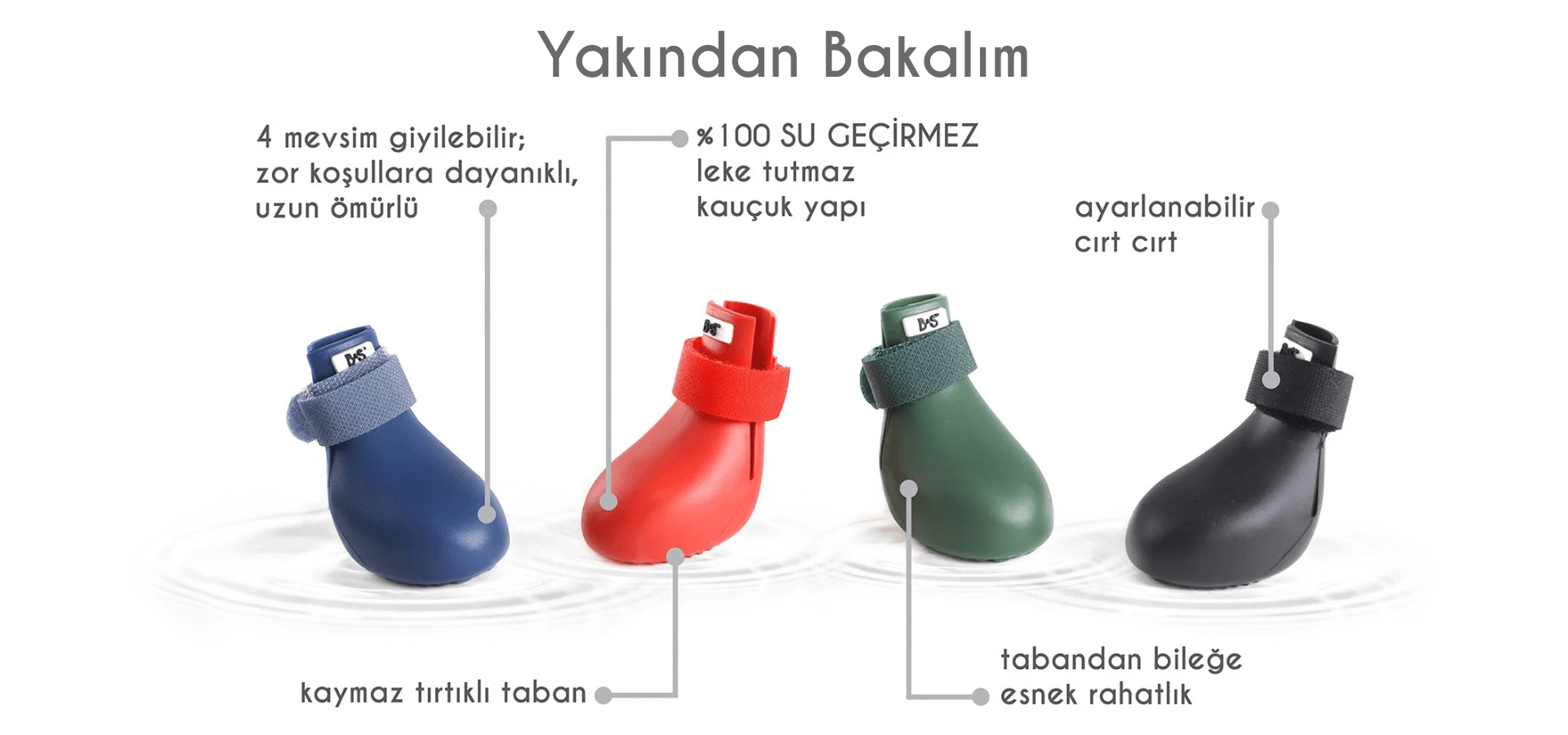 NOT: Tamamı yumuşatılmış, kaymaz kauçuktan yapıldığı için patiden ve bilekten en ZOR kayan, en ZOR çıkan köpek ayakkabısı tasarımlarındandır. Su geçirmez ve hava almaz yapısından dolayı yaz sıcaklarında terletebilir; yazın kurak sıcaklarda kullanılması önerilmez.