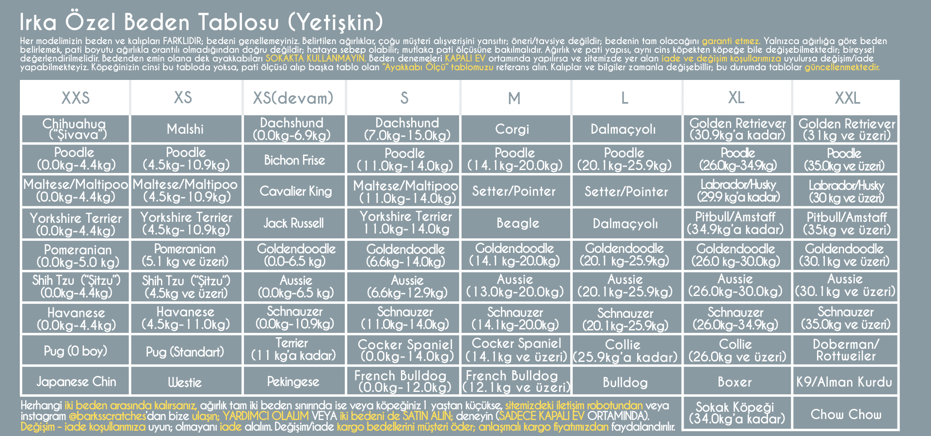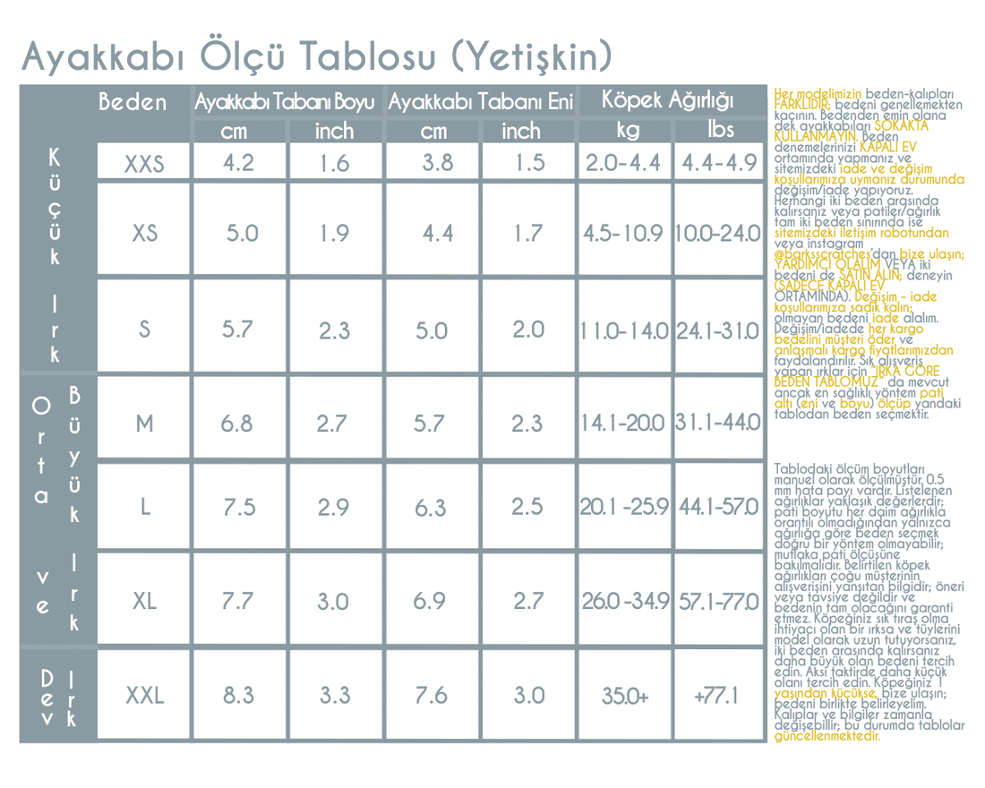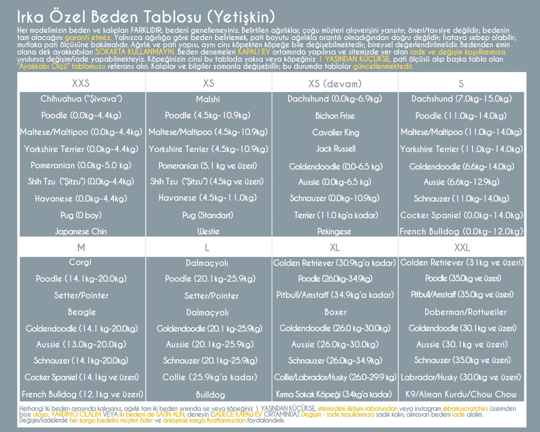 NOT: Tamamı yumuşatılmış, kaymaz kauçuktan yapıldığı için patiden ve bilekten en ZOR kayan, en ZOR çıkan köpek ayakkabısı tasarımlarındandır. Su geçirmez ve hava almaz yapısından dolayı yaz sıcaklarında terletebilir; yazın kurak sıcaklarda kullanılması önerilmez.